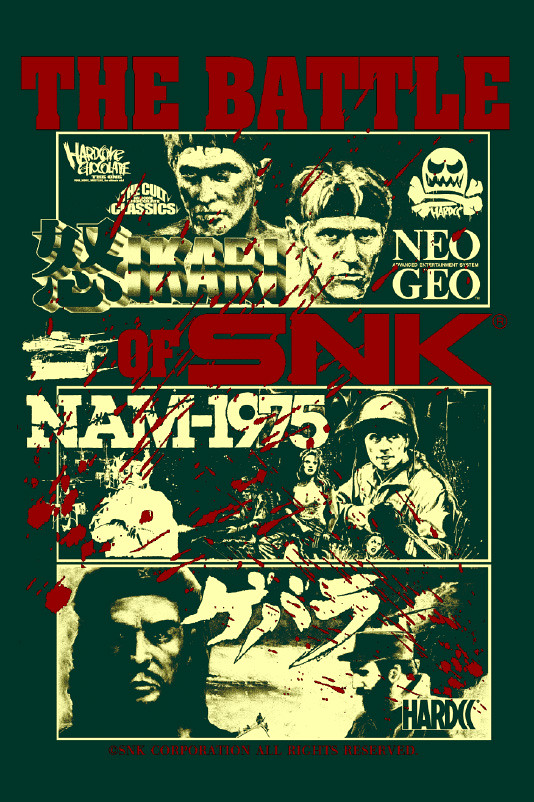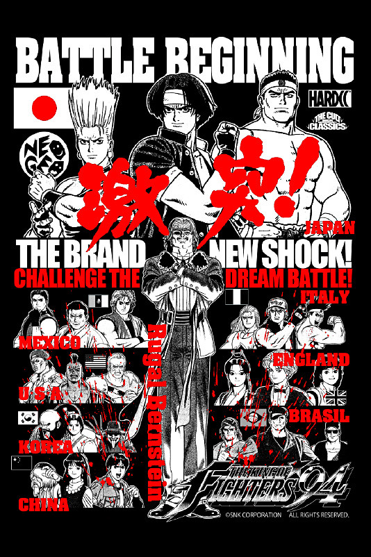 這次「SNK × HARDCORE CHOCOLATE」聯名服飾系列,一共將推出三種款式,包括《格鬥天王94》主題的『激突!-THE KING OF FIGHTERS′94-』;將《格鬥天王94》「怒隊」主題轉化為戰爭電影的『THE BATTLE OF SNK』;以及集結SNK黃金時期眾多經典作品為設計的『World′s Hardest SNK』。 全系列作品皆具有「HARDCORE CHOCOLATE」獨特的強烈風格,搶眼的設計絕對令你成為電玩迷矚目的焦點!