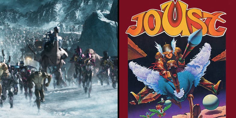 綠洲的創造者 Anorak(亞諾拉克),小時後是亞達利電玩遊戲的粉絲,所以這一幕的蠍子是來自於遊戲 Centipede,而與其對戰、騎著鴕鳥奔馳的騎士則出自於 Joust。順便一提,亞達利也做過許多跟電子爭霸戰有關的遊戲~