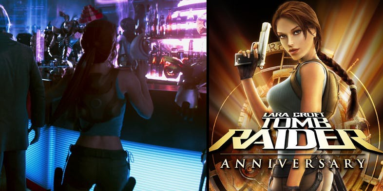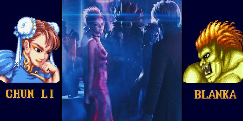 這是男女主角用彼此的化身在約會時的場景,而卡在他們中間是《快打旋風2》裡的布蘭卡和春麗,而旁邊又是《古墓奇兵》的蘿拉卡夫特正在點酒喝,剛好也替新版電影做間接性宣傳吧(因為古墓奇兵新版電影也在華納)