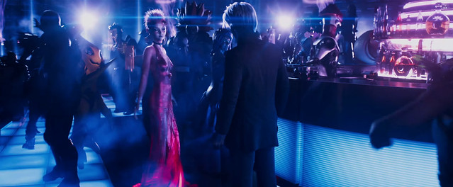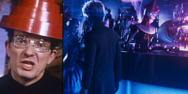 兩位主角約會場景的機器人調酒師,上面戴的紅色帽子是向80年代樂團DEVO其造型致敬。