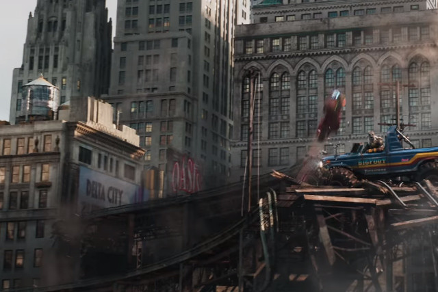 看到後面的招牌寫著Delta City嗎?那就是機器戰警在故事中活躍的虛構城市~