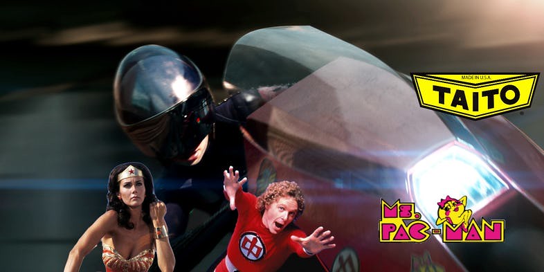 而貼在摩托車的貼紙包含《77年代神力女超人影集》的神力女超人標誌、在下面一點的貼只為史上最經典的超級英雄搞笑影集The Greatest American Hero裡面的英雄標誌、電玩《小精靈》的吃豆子女士,以及創造《泡泡龍》這個知名電玩的遊戲公司TAITO其標誌。