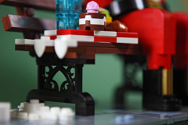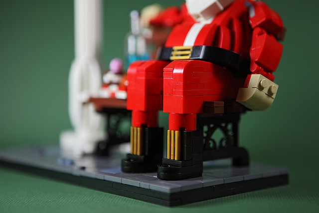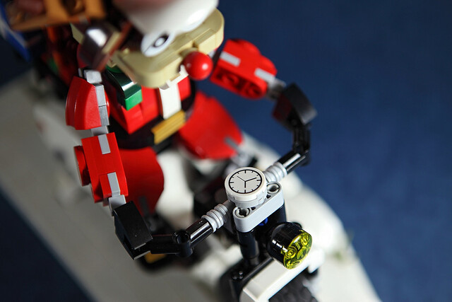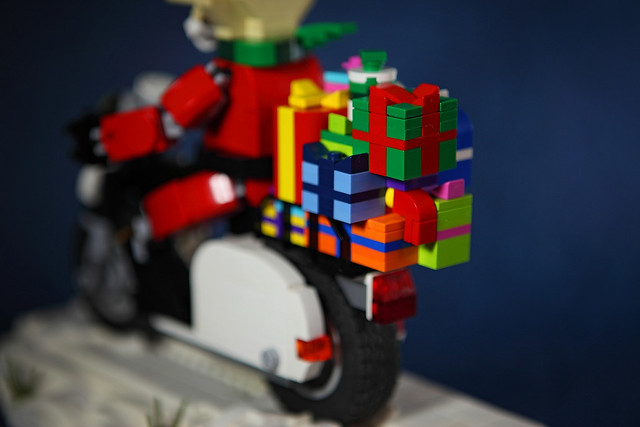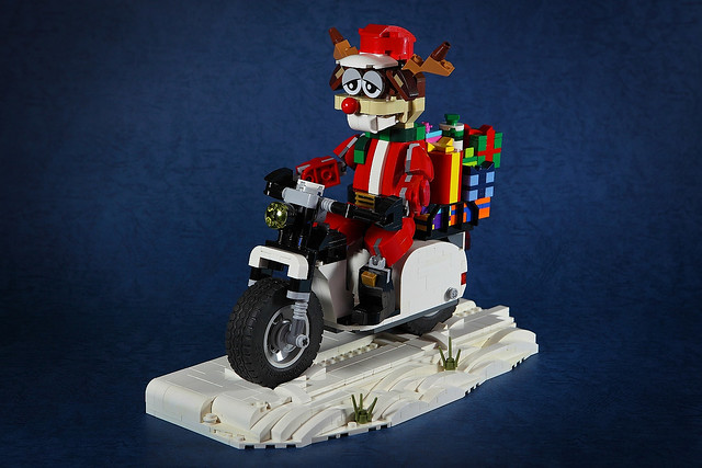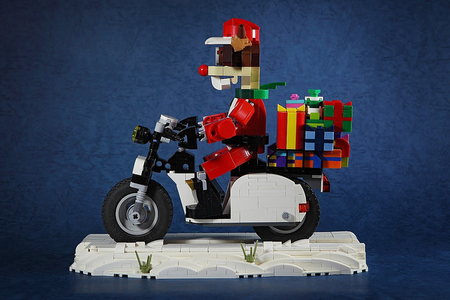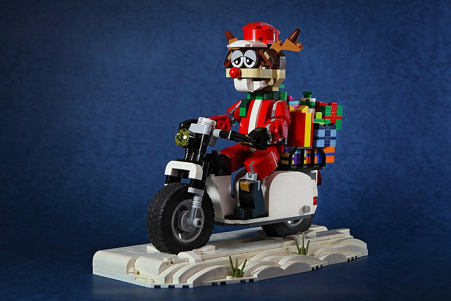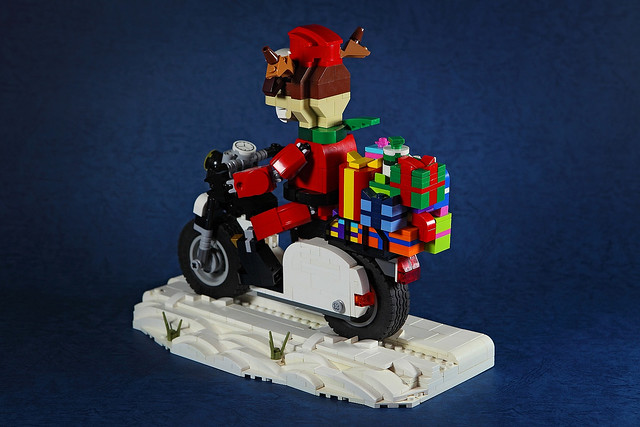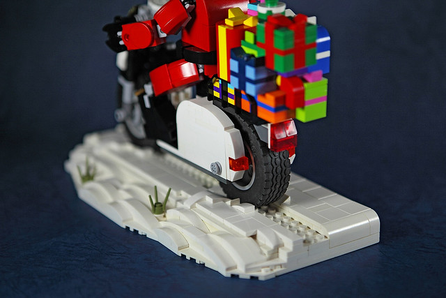 本作另一個看點就是復古的機車與後方置物架上堆好堆滿的禮物,摩托車擁有可愛圓潤的造型,前、後車燈都細膩的做出來,儀表板則是用時鐘零件來代表,禮物堆不只繽紛出彩,每個禮物也都有緞帶的設計超讚的;雪地用了大量的平滑磚、圓弧磚來呈現凹凸不平的樣子,不但寫實也讓作品增添層次感,連輪胎輾過的路面都精心設計,小編真的是跪了啊~~可是疲勞駕駛可是很危險的歐!
