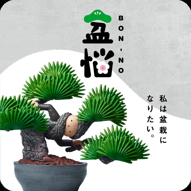 「盆惱(BON-NO)」這個名字的語源為日文的「煩惱(BON-NO)」與「盆栽(BON-SAI)」所結合,宣傳標語「我好想變成盆栽啊。」 作品將人們想追求平靜生活的單純念頭,實踐成為了真實的模樣,逃避煩惱之人與盆栽結合,變成了有趣的「盆惱」造型,絕對讓許多想逃避煩惱、離開喧囂或厭世之人能夠引起共鳴並會心一笑~