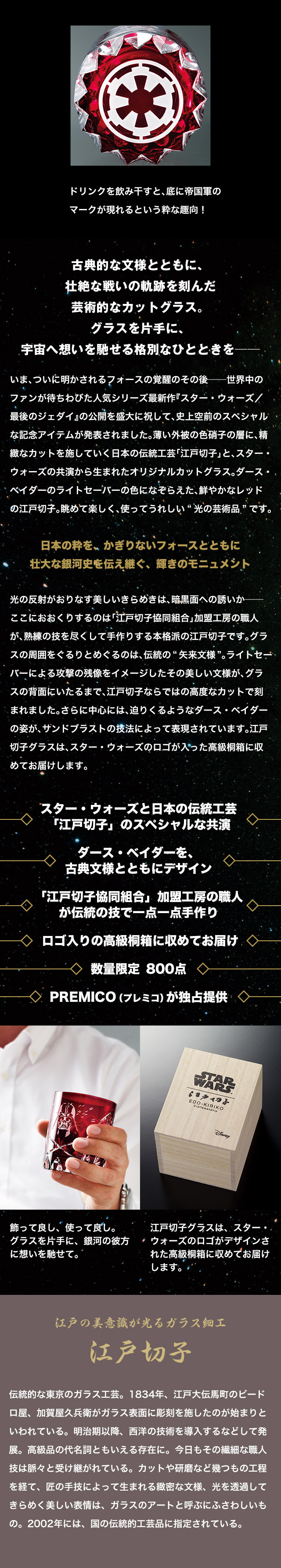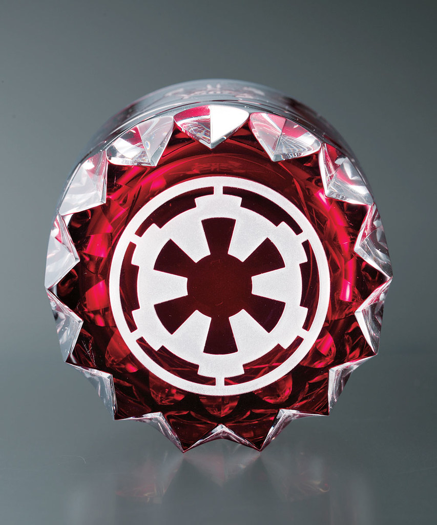 這次由PREMICO 發行、「江戸切子協同組合」職人手工打造的「達斯·維德 江戶切子」,完美結合了華麗的百年工法和黑武士的經典元素,玻璃杯以黑暗面的紅色為主調,達斯·維德的頭像則是用噴砂技術來呈現,背面更是有如光劍對決般的交錯堆疊,有著絕讚的造型力,底部還點綴著銀河帝國的標誌喔!值得一提的是還以印刷精美的桐木箱來包裝,更增添其收藏價值,這根本捨不得拿來用吧~