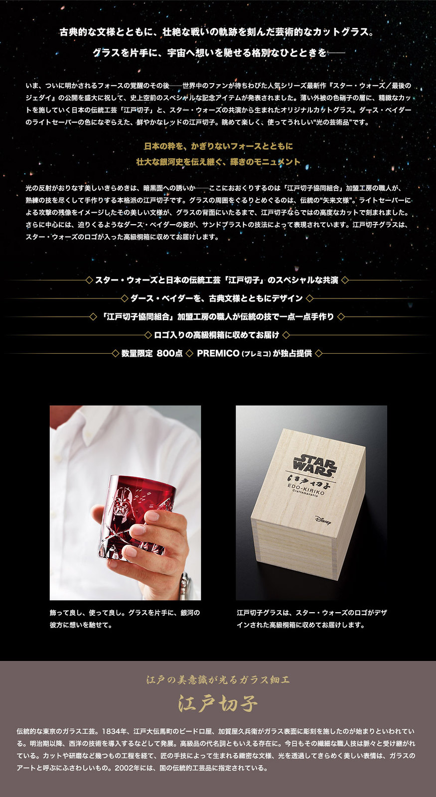 在推出原子小金剛的「機械式手錶」、「高級萬年筆 特製墨水套組」之後,擅長將高質感精品與超人氣電影、動漫元素做結合,推出令人心癢癢限定商品的日本品牌「PREMICO」這次則是把《星際大戰》中最經典的角色與日本傳統工藝「江戶切子」融合,於日前發表了全新商品「達斯·維德 江戶切子」(ダース・ベイダー 江戸切子),將於2018年1月下旬發貨!!