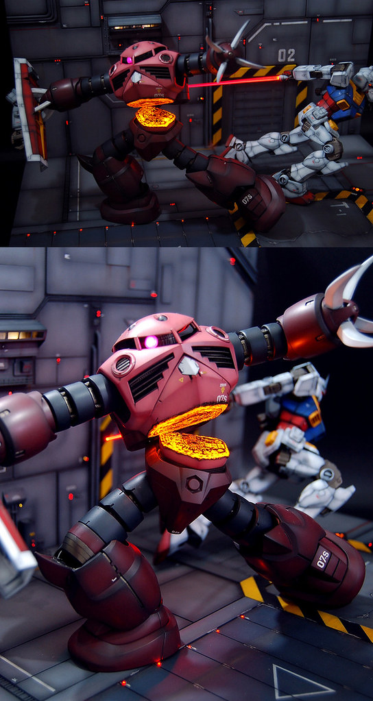 ▼ 茲寇克一刀兩斷,斷面的發光效果處理得太棒了。其它細節的燈飾,例如基地、鋼彈眼睛和光束劍也都非常精彩呢。