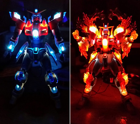 ▼ HGBF 1/144 TRY製作燃燒鋼彈,身上的透明藍色粒子儲存槽,爆氣時會變成紅色,加上LED之後好像真的燒起來了,而且那個鳳凰霸王拳的火鳥功特效也太犯規了吧?