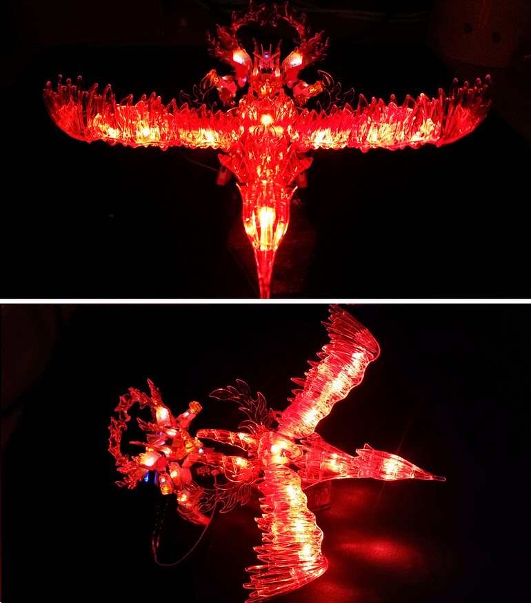 ▼ 報喪女妖和獨角獸的機械骨架是通用的,LED模組可同時適用,隨著金色透明零件,發出瑞氣千條的光芒。