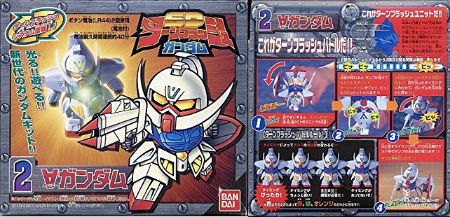 ▼ 再順帶一提,2000年左右曾推出結合聲光特效的SD TURN FLASH系列,將鋼彈倒置,嗶嗶聲之後,三秒轉正,只要時間正確,額頭、眼睛和胸口三個燈會同時亮起,非常有趣。這個系列只推出初鋼、紅薩克、Z鋼、倒A和飛翼零式改。