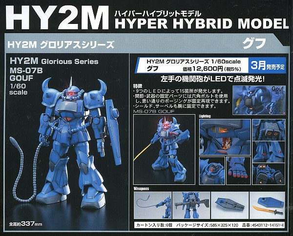 2002年左右,鋼普拉推出一系列名為HY2M(Hyper Hybrid Model)的實驗性系列,使用各種最新研發的創新素材來製作新概念模型,包括1/12等身大鋼彈和薩克,以及大量使用LED的1/60古夫和里克‧德姆,另外也推出MG改造用的HY2M-MG發光套件,為LED技術開創出一條進化之路。