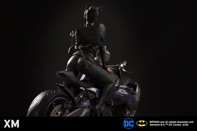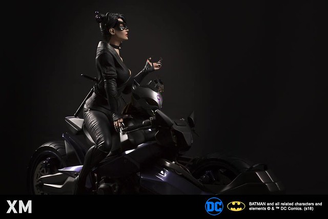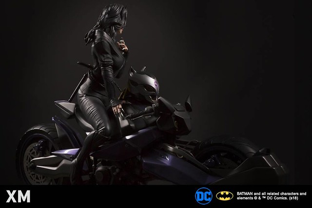 「貓女 1/4 比例全身雕像」呈現出跨坐在機車上的姿態,緊實的身材加上散發誘人魅力的雙眼,再搭配皮衣和長靴,完整表達出貓女致命、性感的形象,根據目前釋出的商品圖跟資訊來看,將會豪華地附屬戴著貓面具、無面具長直髮,以及將頭髮以髮髻盤起來、戴上眼罩的三種替換頭雕,左手也有三種樣式,包含拿著裝有珠寶的錦囊、皮鞭、強調銀灰色貓爪的空手型態,更增加了展示的變化性。