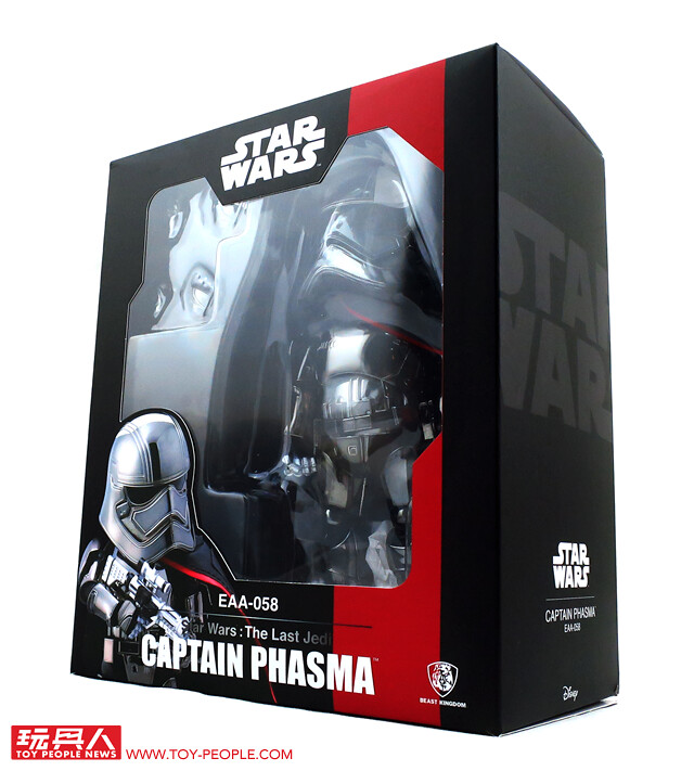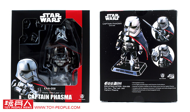 因應新作第八部曲的上映,由台灣廠商野獸國所設計的「Egg Attack Action(EAA)」系列,也推出了新款的知名要角-來自第一軍團(First Order)的「法斯瑪隊長」(Captain Phasma)。法斯瑪雖然身為第一軍團風暴兵(Stormtrooper)的隊長,但是個性和作風都相當強悍的她,卻是一位不折不扣的巾幗英雄,不僅在各種戰技上展現了過人的能力,在戰場上也往往是個身先士卒的前鋒,對於志在復興帝國的第一軍團而言,法斯瑪隊長可說是個無可取代的存在。在七部曲《原力覺醒》(Star Wars: The Force Awakens)中險些魂喪垃圾處理機的她,終於在《最後的絕地武士》再度歸來,她該如何和棄暗投明的芬(Finn)了結過去的恩恩怨怨呢?就請各位在戲院中見分曉吧!