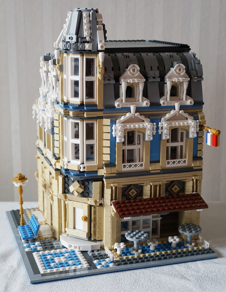 Lee Inyoung 十分擅長用現有的盒組來重新組裝,這次他則是把英國著名的地標「倫敦塔橋」改裝成一棟掛有法國國旗的精美建築。屋子本體有著看起來十分舒服的對稱結構,每個窗台的細節也用心打造,路燈長椅、戶外座位區更豐富了街道,而地板的顏色、花紋也是對稱的。