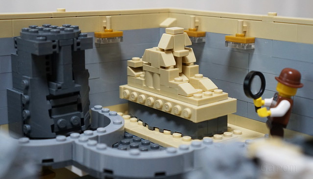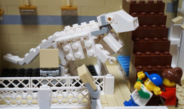 再來是內裝,博物館的部分不但有暴龍、翼手龍的骨架展示,摩艾像、人面獅身的微縮模型更是令人眼睛一亮啊~也用圍欄、不同顏色的磚來做出分區的結構,是個不錯的巧思,但可能受制於零件,內裝跟華麗的外觀相比,設計顯得較為簡單。