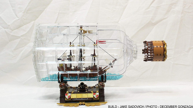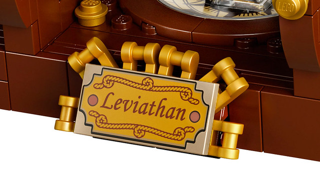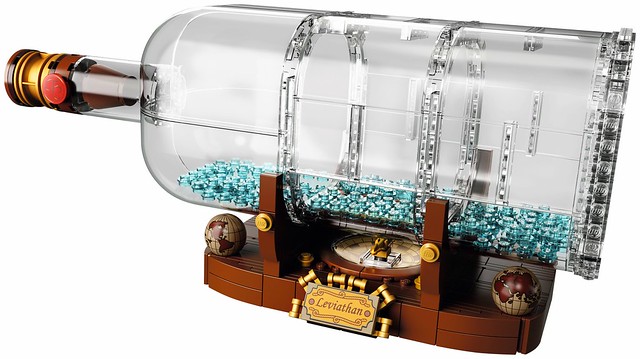 完整官圖公開之後,總算能一窺完整的瓶子與瓶中小船的全貌,官方應該是為了顧及瓶身的造型和視覺美感,減少零件之間的拼接痕跡,最後才使用這樣的比例,就算沒有裡頭的船,光瓶子本體就相當優美,而小船雖然沒有原作者設計的那麼豐富、逼真,但為了放入較窄的瓶身所作出的調整也很令人滿意,最後是展示木台,兩邊的立體航海地圖十分漂亮,中間更是打造出羅盤的樣貌,採用全新印刷的碟盤零件非常有味道啊~加上取自傳說中海怪「Leviathan」的名牌零件不僅依循了原作者為這艘船取的名字,也增添整體的收藏價值歐。