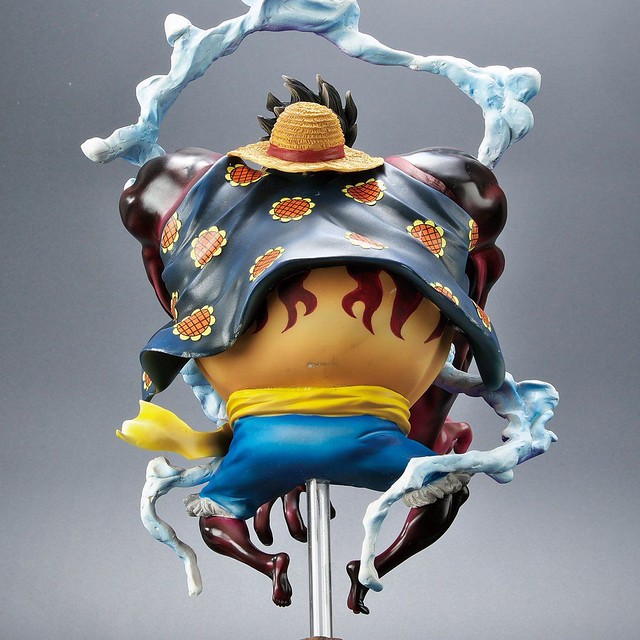 本作全高約36 公分,完美展現出四檔魯夫使出「獅子・火箭炮」的強大魄力!從表情、軀體到雙手,其造型皆有著逼真細膩的刻畫,胸口傷痕、陰影效果讓魯夫的皮膚顯得更加立體,四肢則施以深淺不一的黑紅色塗裝,雙臂粗壯的肌肉線條精緻地形塑,飛揚的背心、纏繞於身的雲霧也提升了本作的動態張力,配上土石場景地台和透明的支撐架,最大限度地還原魯夫施展必殺技的霸氣姿態!