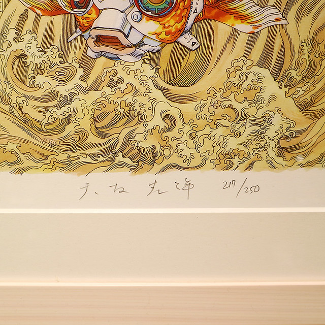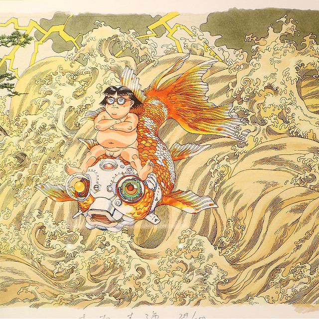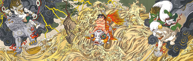作品內容繪製的是搭乘著機械鯉魚前行的“金華童子”,兩旁護航的是分別乘著大石獅的風神與雷神。即使在波濤洶湧的危險之中,他們的神情仍不改從容,彷彿已看到前方正等著他們的希望。大友表示,此作品的創作源頭,是希望肩負著日本未來的孩子們,能夠藉助現代人的睿智,面對來自大自然強大力量的挑戰,繼續勇往直前。本作品在大友的希望下,將部份收入義捐給宮城縣,以幫助東日本大震災後的復興事業。