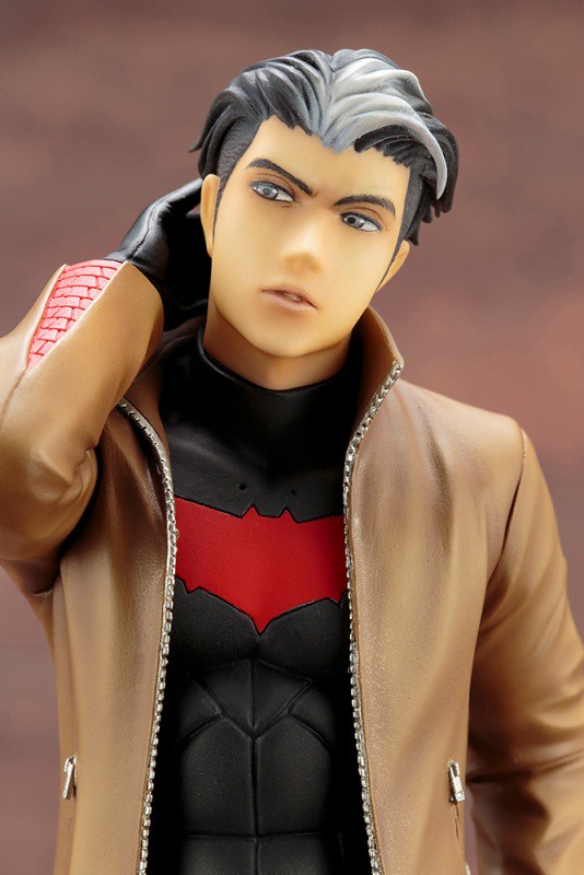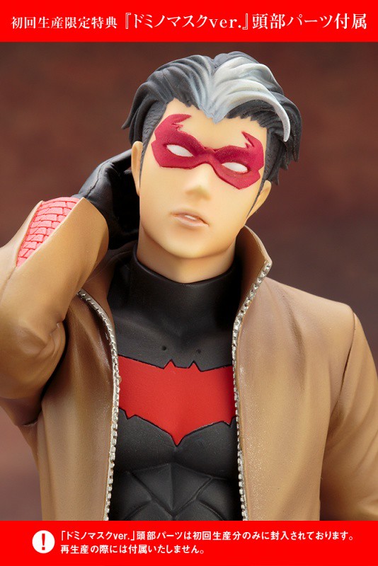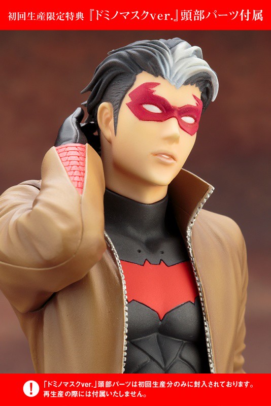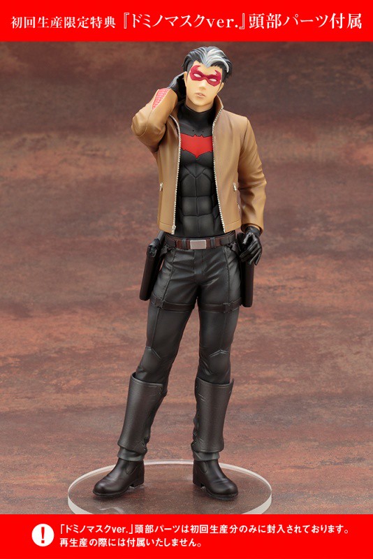 「DC COMICS美少男 紅頭罩」跟看起來溫柔、陽光的「夜翼」雖然都是美型男,但他散發出一桀驁不馴的叛逆氣質,非常貼近本人的角色性格,右手摸著後頸、痞痞的眼神可說是完美詮釋了男人不壞,女人不愛啊~頭髮有著細膩的漸層上色,服裝也更有層次感,外套的拉鍊、長褲的皺褶、兩側的手槍皆精緻地刻畫,小腿部分的護具更呈現出刮痕的寫實作舊,還附屬了紅色頭套的替換配件;而初回生產限定配件是帶著「多米諾面具」(ドミノマスク)版本的替換頭雕!