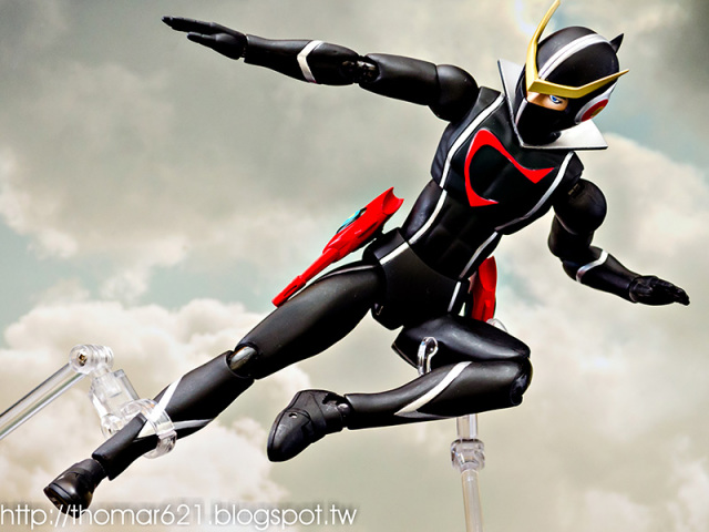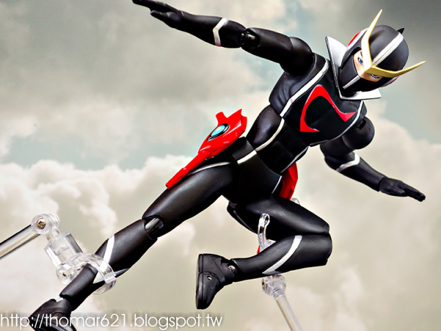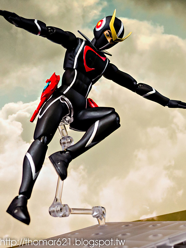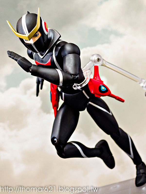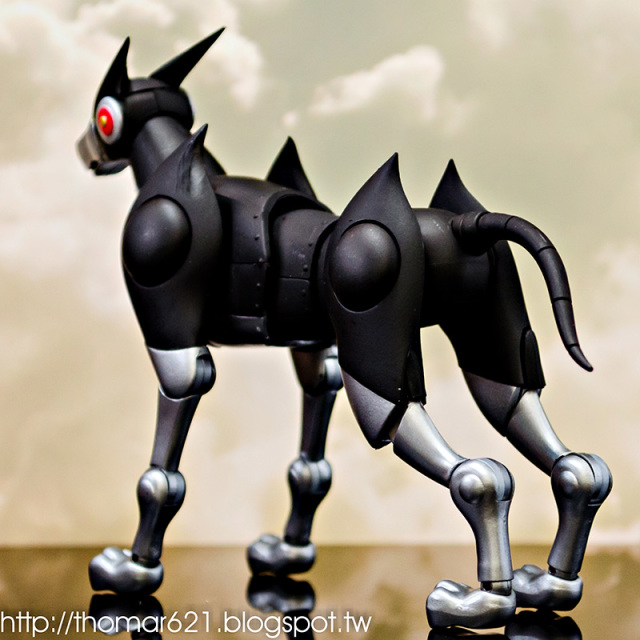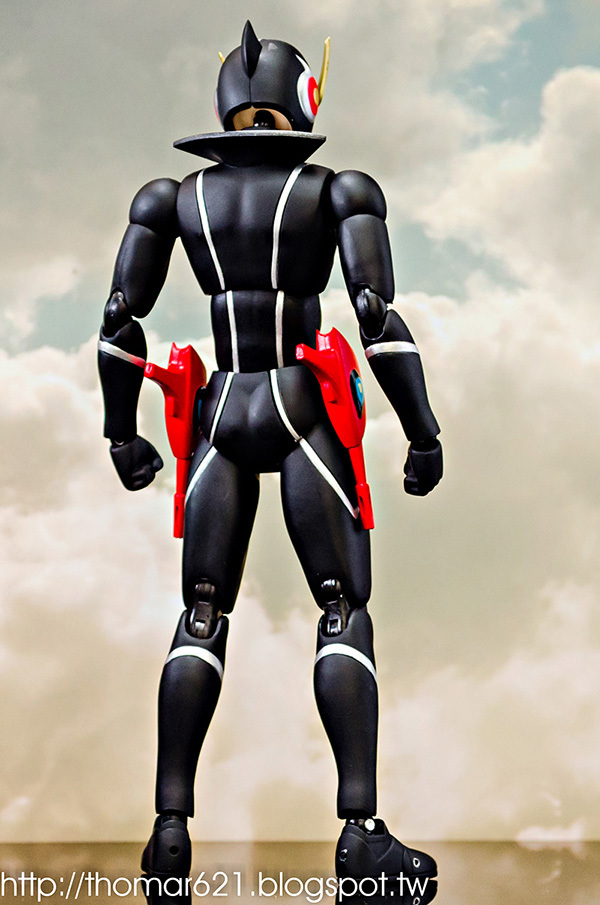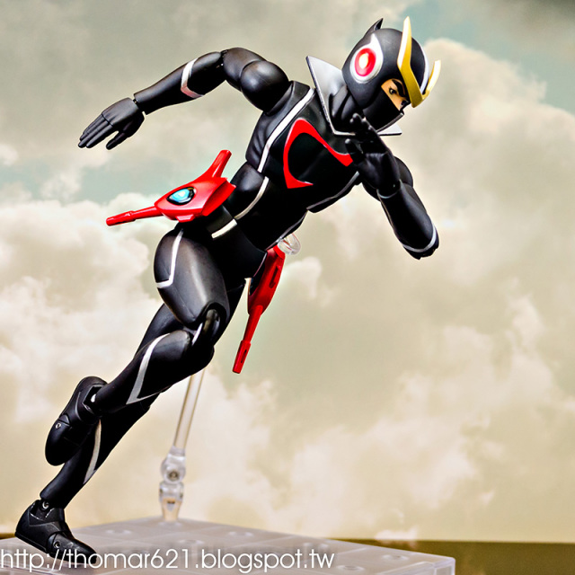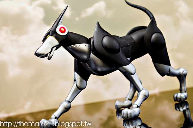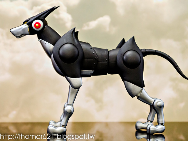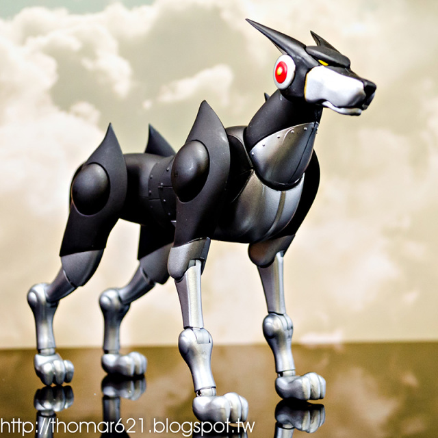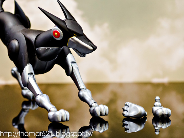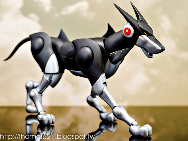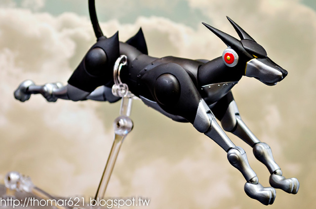 人偶高度為 20 CM,關節配置很像早期的 SHF,手型很多,腰部的槍不用替換可以卸裝,也配有持槍手型。內有附個多重關節的透明支架跟地台,浮空的話撐狗還可以,撐人有些不夠力。口徑跟笨呆的魂 STAGE 差不多,可以考慮用這系列來擴充補強。