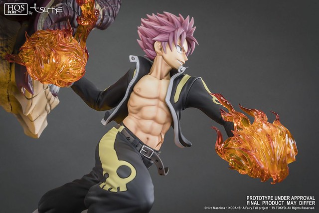 「HQS+ 納茲 1/4 比例全身雕像」高約78 公分,Tsume-Art 以高超的製作工藝將納茲和火龍伊格尼爾以極具動感的姿態立體化,向前飛躍的納茲雙手纏繞著熊熊火焰,彷彿正要使出招牌絕技「火龍的鐵拳」,從頭髮、肌肉線條到服裝的皺褶皆考究地還原;而後方的伊格尼爾更給人強烈的視覺衝擊,不但再現了鱗片、皮膚粗糙的質感,圍繞於四周與口中吐出的火焰特效更是張力十足,值得一提的是在伊格尼爾的雙眼和底部的火焰內部還設置LED 發光功能,收藏價值再提升!