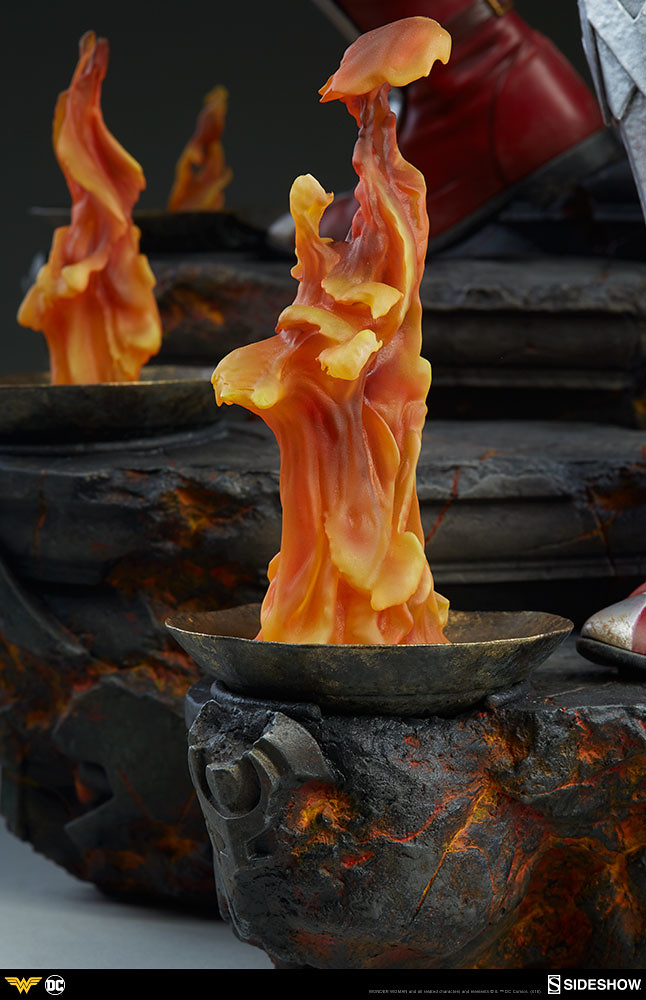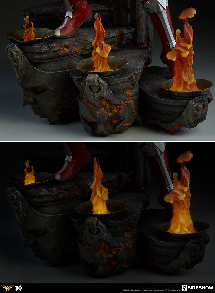 裝備和武器的用色也相當鮮豔,招牌的紅、藍搭再配上搶眼的金色,同時也注入許多星星的元素,馬甲的皺褶極為寫實,盾牌的樣式可說是相當花俏啊~背在身後的長劍劍柄處則有著WW的標誌,光是本體就有非常多值得玩味的造型細節,階梯狀地台上的火焰還有微微的點亮效果;而EX 版本還追加了裙子可以替換,不僅增添展示的變化性,也不會讓女神的屁股著涼啦~