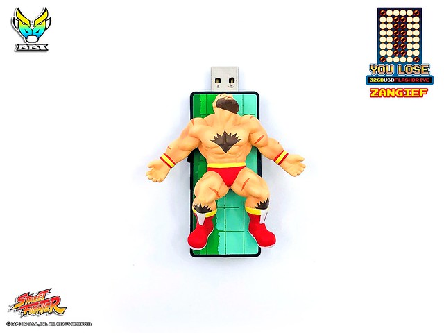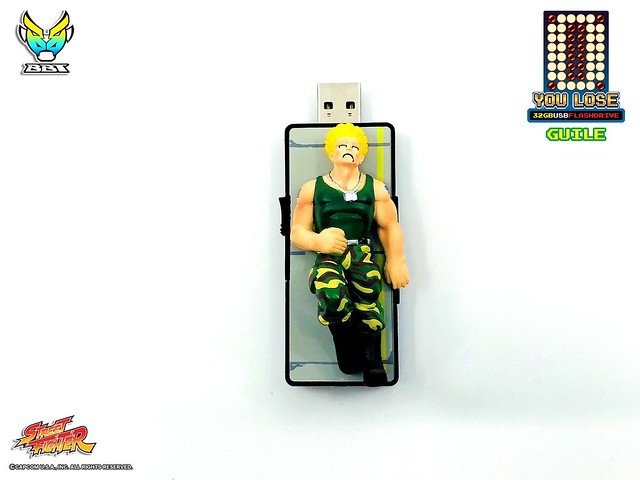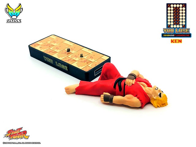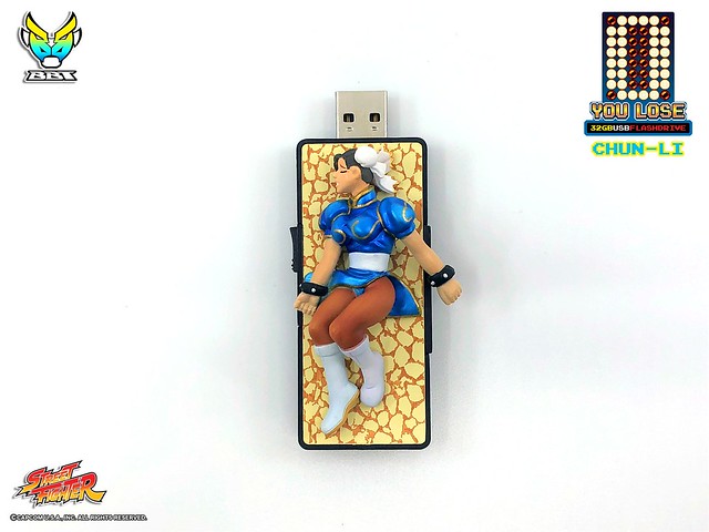 「快打旋風角色造型隨身碟」目前一共推出隆、肯、春麗、凱爾、桑吉爾夫、貝卡六款角色,容量則有32GB,呈現出被打倒在地的苦哈哈姿勢,服裝造型的還原度和肌肉線條的刻畫都非常不錯,除了本體之外,地台兼與電腦連接的USB 則設計成《快打旋風》電玩中的場地造型,六款都不同歐~伸縮結構的接頭也讓本作可以在不用的時候當個逗趣展示品,使用時「YOU LOSE」的字樣還會發亮,實在是太嘲諷啦~