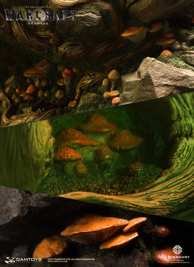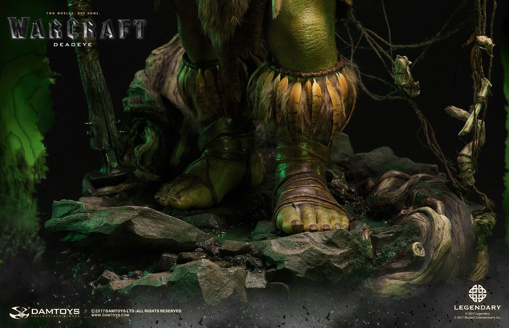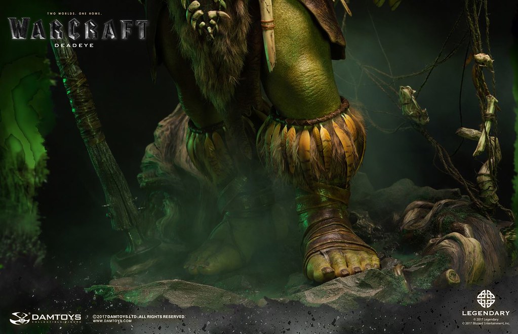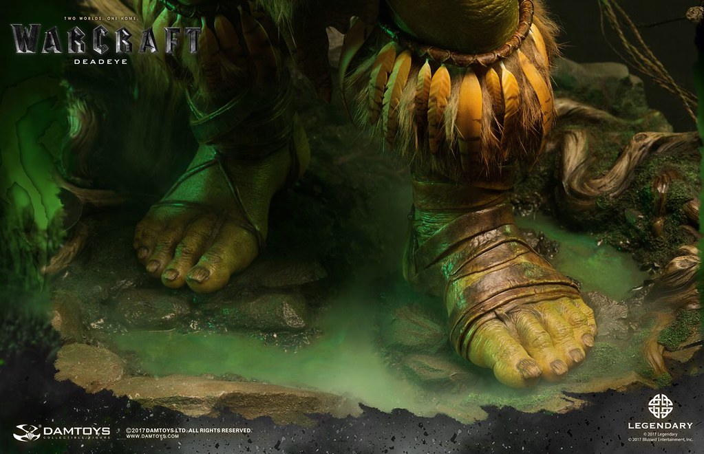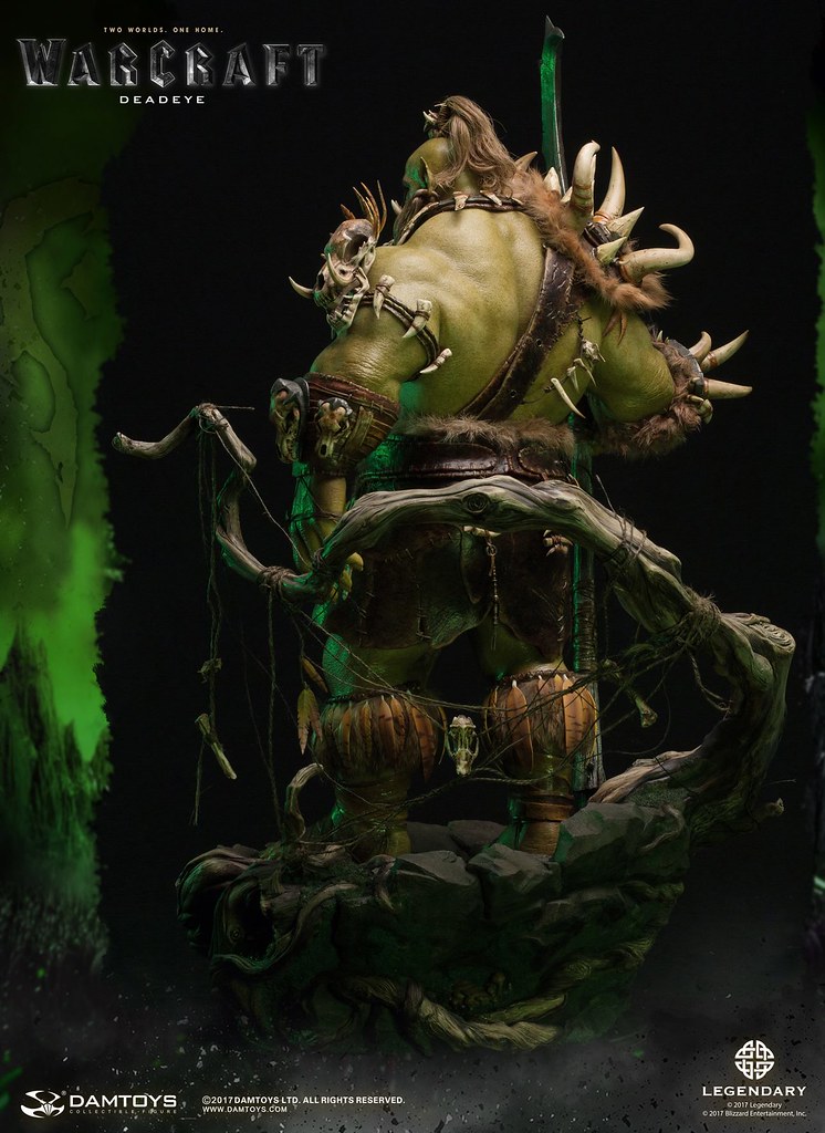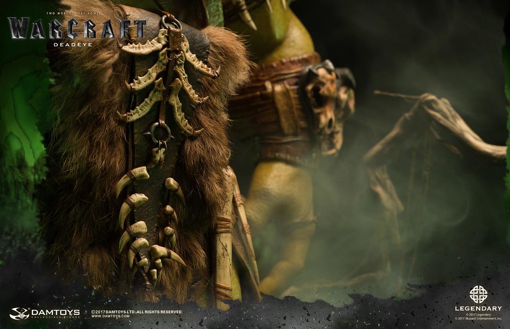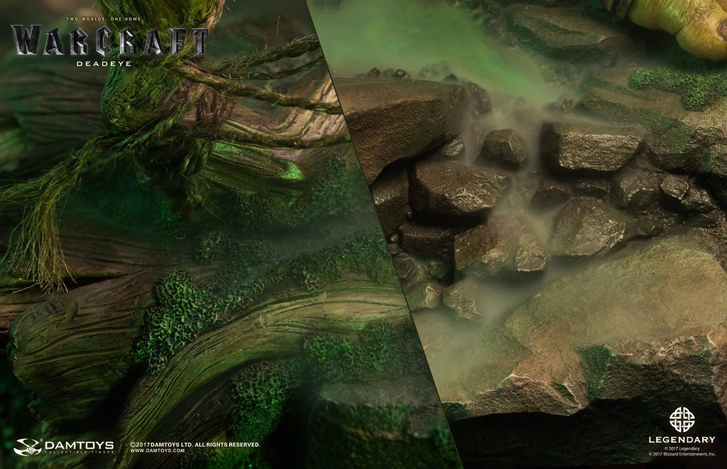 DAMTOYS 以極為精湛的製作技術逼真地再現了基爾羅格·死眼在劇中的樣貌,右手握著長槍,威風凜凜地佇立著,墨綠色的皮膚有著粗糙、寫實的紋理,即使只剩一隻眼睛,兇惡的表情加上巨大的牙齒仍然霸氣十足,以布料和皮革製作的服裝、全身的骨頭裝飾皆考究還原,細部環節和上色都十分精緻,最大限度地還原電影中的造型設定,高超的植髮工藝更讓本作增添真實感;地台則是以獸人首度穿越傳送門到達艾澤拉斯的場景來設計,豐富的植披、樹幹、岩石等元素讓本作完整性再提升!