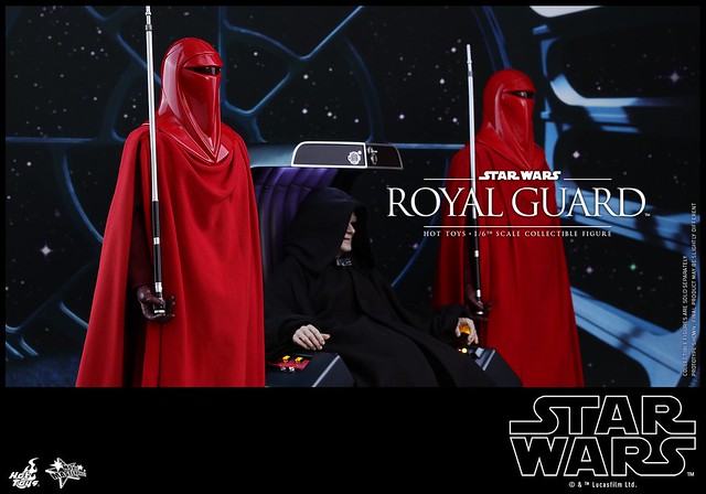 在推出《星際大戰五部曲:帝國大反擊》版本的「達斯‧維德」、「波巴‧費特」、「波巴‧費特 豪華版」之後,Hot Toys 日前再度發表來自《星際大戰六部曲:絕地大反攻》的新品,「皇帝 白卜庭」、「皇帝 白卜庭 豪華版」和「帝國皇家禁衛軍」同步登場,「帝國皇家禁衛軍」(Royal Guard)1/6 比例人偶預計將於2018年第四季~2019年第一季發貨!!