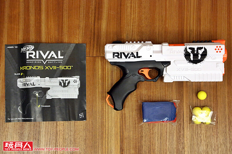 ▼ 內容物一覽:克羅諾斯XVIII-500 發射器本體、球彈*5、紅藍綁帶一組與說明書。