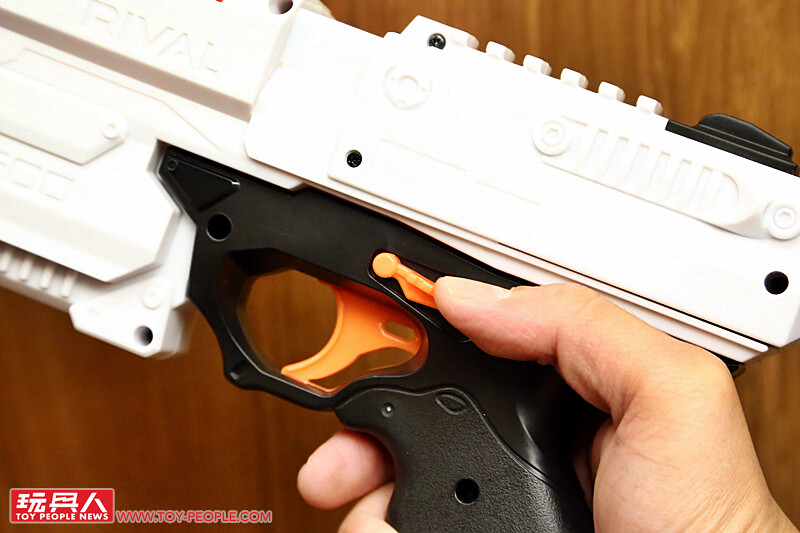 ▼ 由於NERF 決戰系列具備了強大的威力與射速,所以每一把決戰系列的發射器都內建有保險裝置,記得要養成平時關保險(safety on)的習慣,才不會誤擊造成危險。