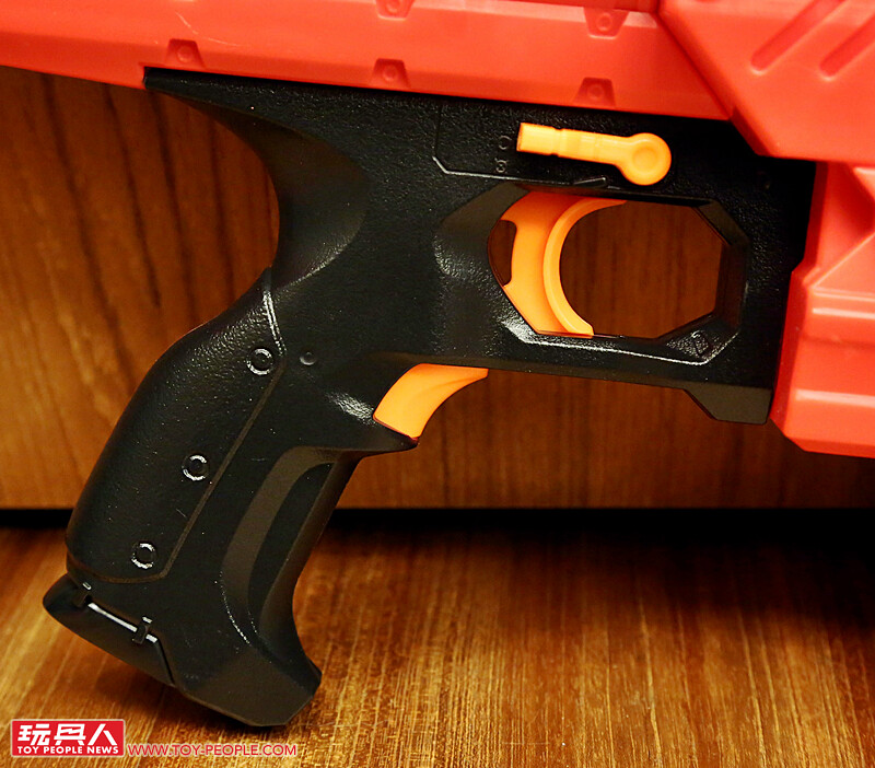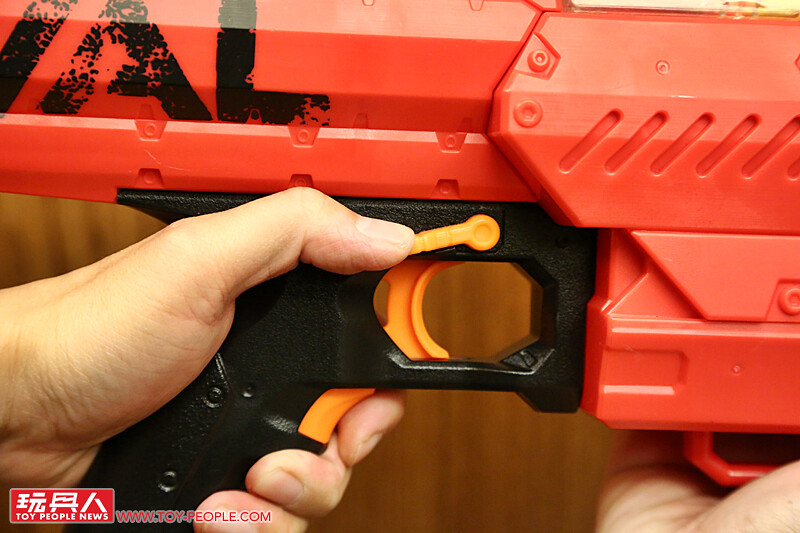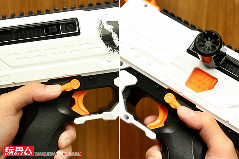 ▼ 由於是電發槍,所以設有雙重扳機。 下方中指扣壓的扳機為第一階段,持續按壓就會啟動馬達;中指不放開的情況下,食指扣壓就會啟動第二階段開始射擊,基本上NERF 的電發槍都採用相同的設計。