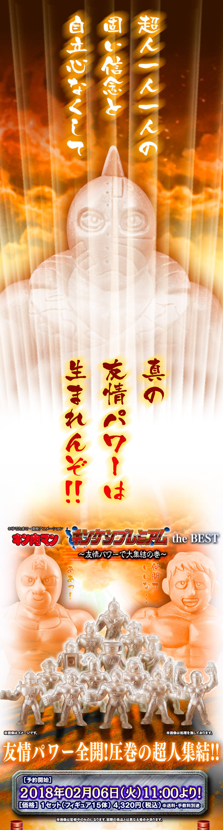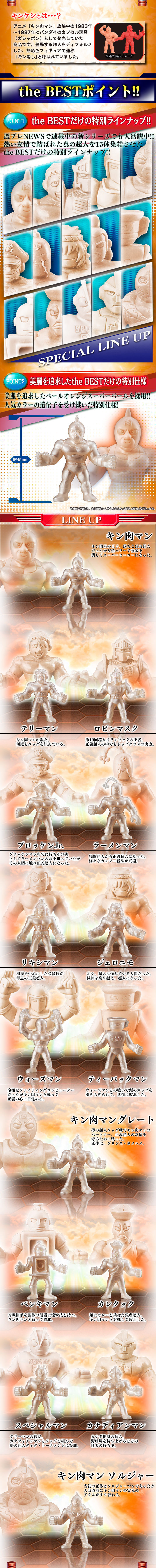日Bandai萬代玩具公司把復刻早期以橡皮擦材質來製作成的《金肉人》角色人偶作品,首波已經預計推出「序章的巻」、第二彈「正・悪・完璧大乱闘の巻」以及第三彈「感淚的珠玉超人大亂戰之巻」,還有第四彈「威脅持續襲來之巻」以及第六彈「死亡之戰的結束是・・・之巻」還有特別彈「惡魔超人大集結之巻」後,近日官網繼續公開將推出"特別彈(the BEST)"「友情力量大集合之巻(~友情パワーで大集結の巻~)」(名稱暫譯)的系列續作!