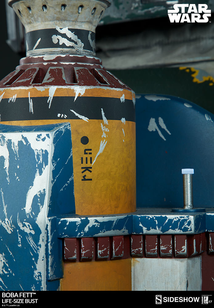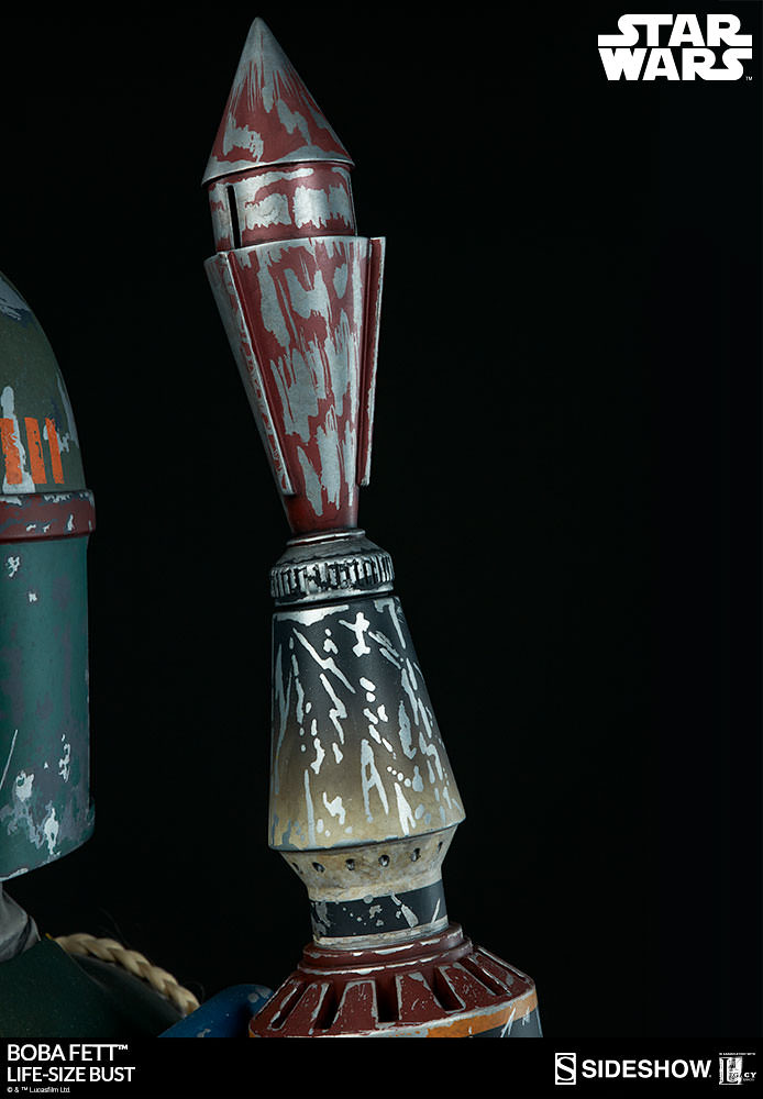 「波巴·費特 1:1 比例半身胸像」高約76.8 公分,以高水準的製作技術完整再現了這位賞金獵人帥氣的樣貌,盔甲上的凹痕和戰損處理、以絕地武士髮辮做成的麻繩,以及噴射背包上半部的細節皆考究地還原,除了頭盔本身可以轉動之外,右半邊的測距儀也搭載了可動的設計,可以呈現出他瞄準敵人的姿態,值得一提的是胸甲還設置LED 發光功能,展示起來更有氣氛歐~