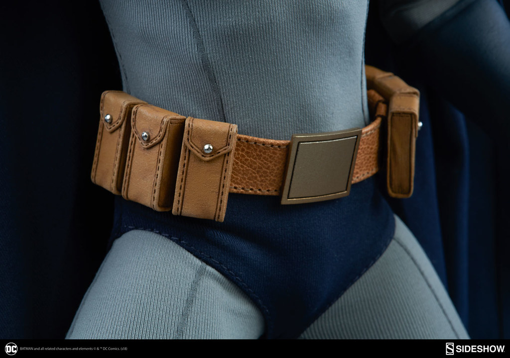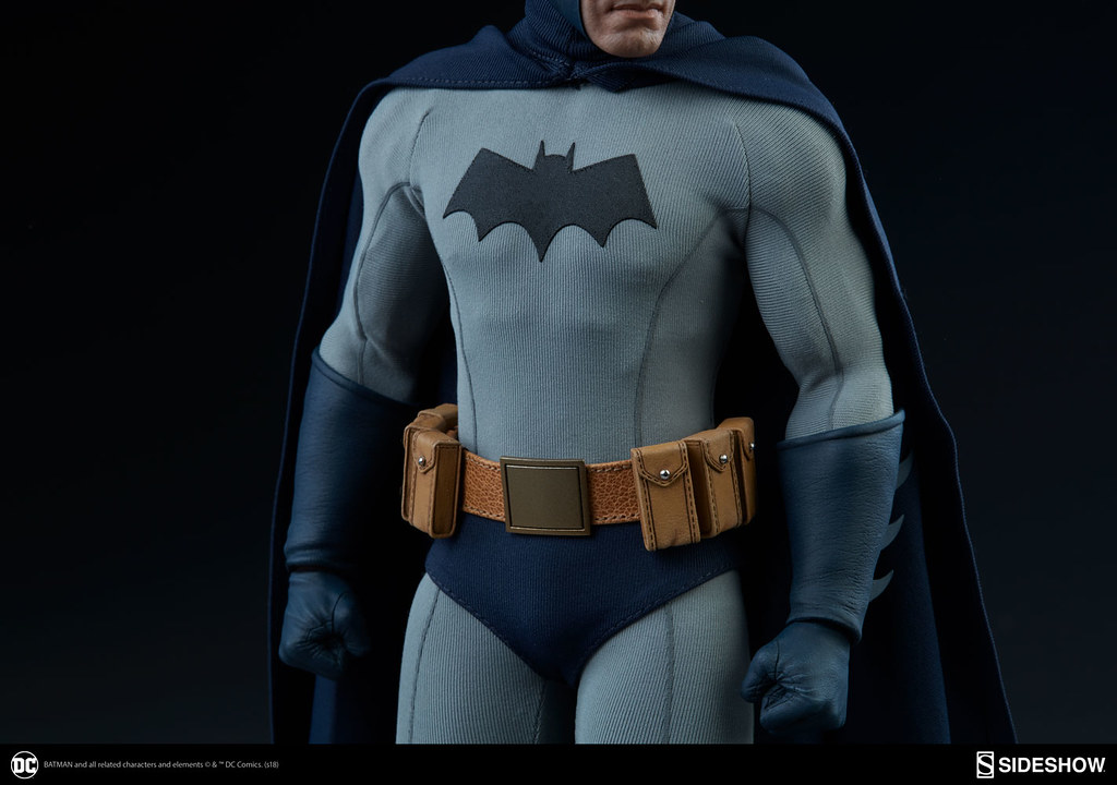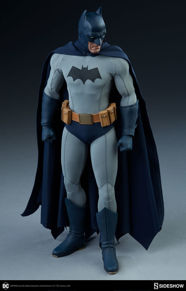 「蝙蝠俠 1/6 比例人偶」高約30 公分,貼身的蝙蝠戰衣採用藍、灰配色的復古樣貌,肌肉的線條也有逼真的展現,服裝以布料和塑料等複合式材質打造,面具、腰帶、靴子等部分都有類似皮革的質感,尤其腰帶上的口袋更是相當寫實,除了面罩上的紋路刻畫很有蝙蝠俠一貫的皺眉特色外,露出來的臉更是精緻地形塑出皮膚的紋理。