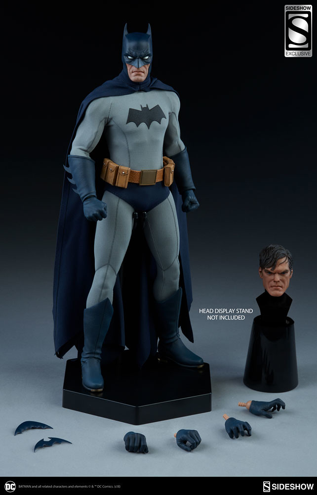 配件部分附屬了兩種不同型態的蝙蝠飛鏢,以及三對替換手型,絕對可以再現這位黑暗騎士的帥氣風采;而在Sideshow 的EX 限定版中,還追加了一個根據漫畫造型所製作的「布魯斯·韋恩」脫罩頭雕,果然蝙蝠俠連脫下面罩之後也是一副心事重重、眉頭深鎖的模樣啊~如果家裡的蝙蝠俠人偶都是身穿黑衣,不仿考慮看看這款灰、藍配色的蝙蝠俠歐!