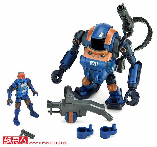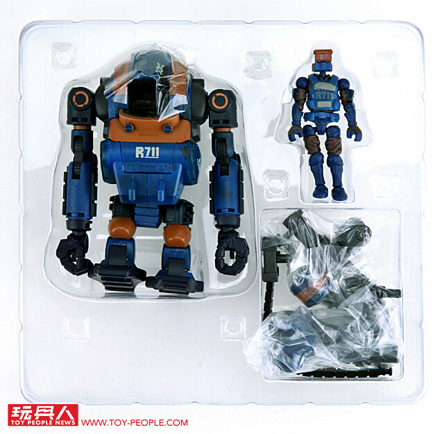 ▼ 內容物一覽:R711鎮暴人形機甲駕駛員、R711鎮暴人形機甲LA3R本體、轉接環與駕駛員標準配備手槍。
