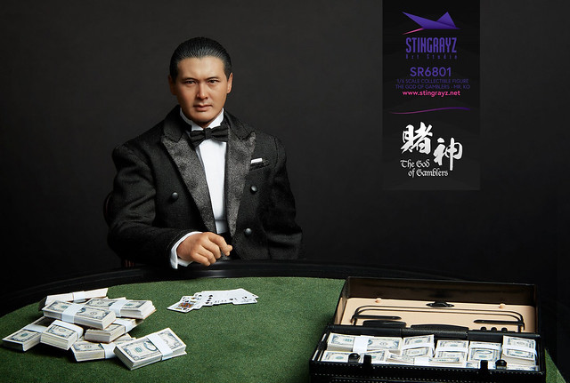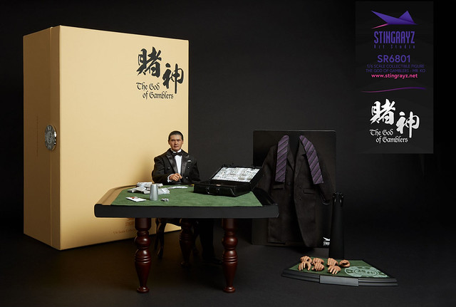 「高進 1/6 比例人偶」高約30 公分,全身有30 處可動關節,不但完整重現他劇中的服裝造型,臉部表情和髮型也都精巧地形塑,而且還豪華地附屬了一張表面以絨面皮革覆蓋的賭桌和木椅,以及大把大把的鈔票、撲克牌、骰子、Feodora 巧克力、瑞士銀行本票信封等豐富的配件內容歐,絕對可以再現「賭神」在賭桌上的英姿啊!