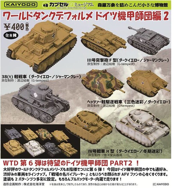 日海洋堂玩具公司主攻精緻縮小比例尺寸的盒玩和轉蛋商品,相當受小車玩具人喜愛的膠囊Q博物館「世界坦克系列」,從2013年開始推出的第一彈「德國坦克裝甲師團」、第二彈「第二次世界大戰名戰車編」、 第三彈「陸上自衛隊編」、 第四彈「第二次世界大戰主力戰車編」以及 第五彈的「陸上自衛隊編 2」等等多波的系列續作後,這次將繼續推出其"第六彈"「德國坦克裝甲師團編 2(ドイツ機甲師団編2)」的轉蛋商品續作。