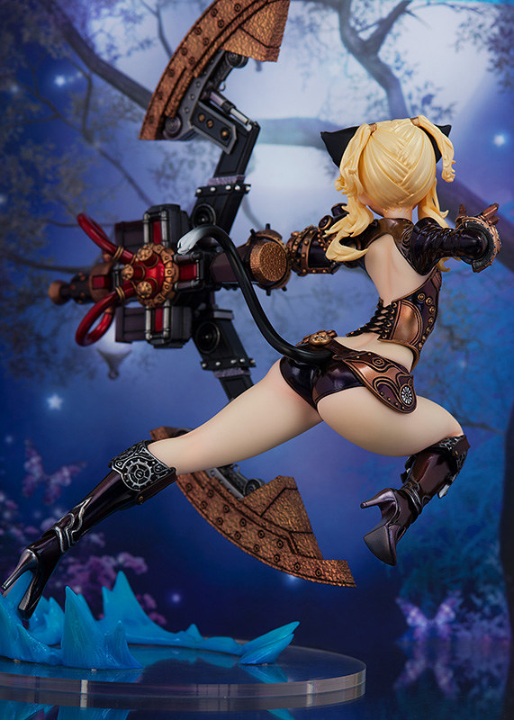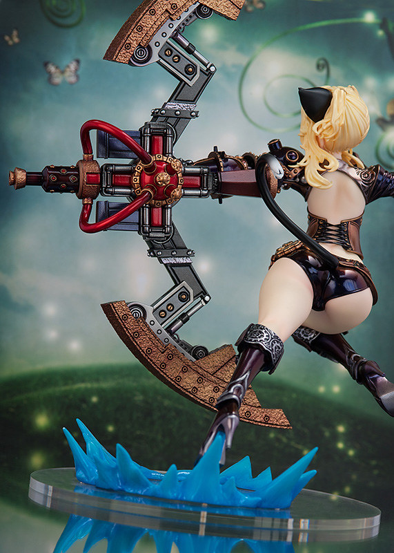 此次立體化的艾琳將穿上另一套人氣時裝「蒸汽龐克套裝」,賦予了滿滿「蒸汽動力機械」元素,以極為躍動的射擊姿態登場。光是服裝上就有著密集的齒輪、鉚釘、活塞等細節,並施以極具質感的古銅色塗裝,呈現比遊戲模組還精密的造型。巨大的蒸汽弓也具備精密的機械結構、真實的金屬塗裝,展開的弓臂更有鑄鐵般粗糙的表面,極具重量感!