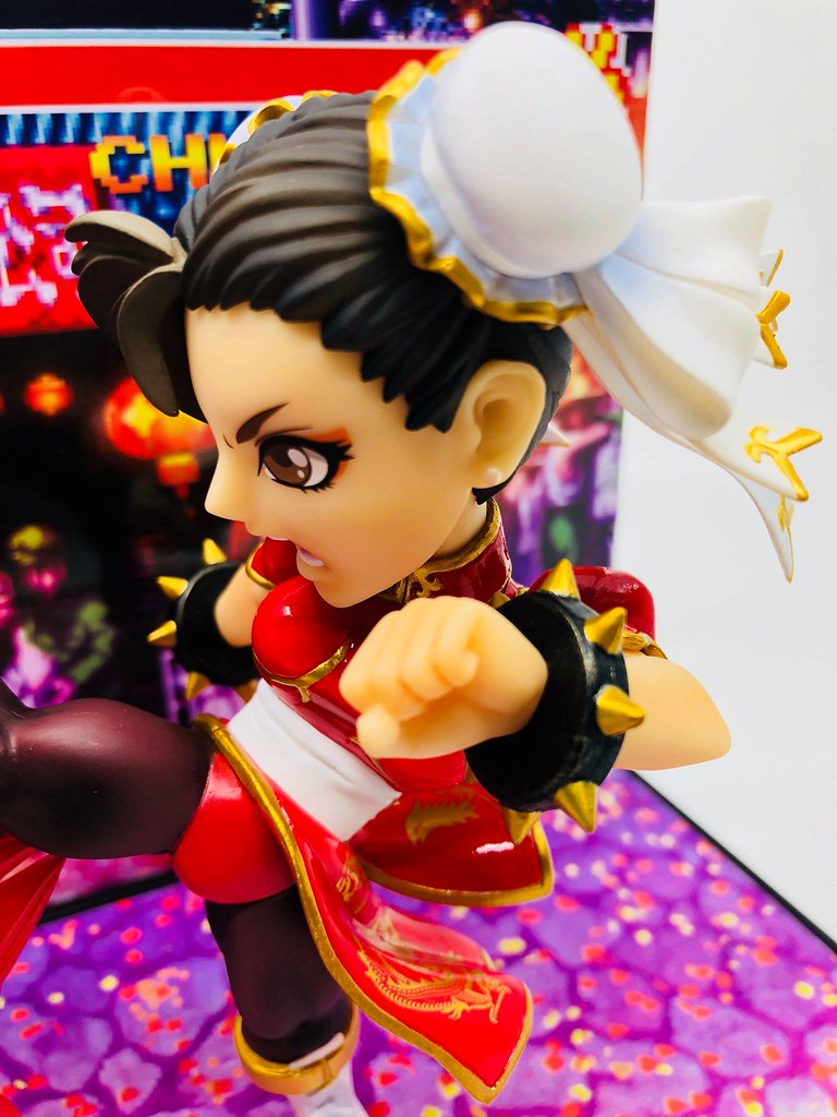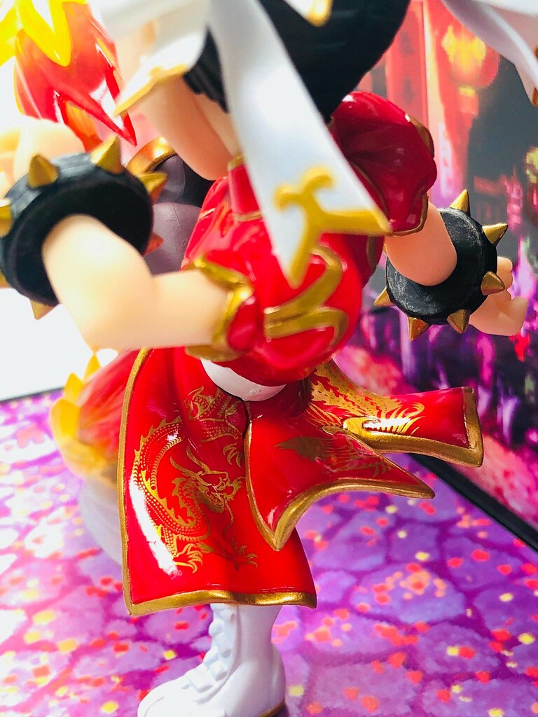 同樣是以絕技「百裂腳」為設計主題,BigBoysToys 將春麗以獨特的頭身比例Q版立體化,紅、金配色顯得十分貴氣,而且連百裂腳的攻擊特效也變成紅色,動感十足的姿態、必殺的表情,都讓這款可愛的春麗同時展露出格鬥家的魄力!而且還包含兩款背景卡紙跟地台供各位玩具人自由替換歐,由於是新年限定款,除了旗袍上龍飛鳳舞之外,在包裝盒上也有「萬事如意」的字樣,背面則是手寫的編號,更添收藏價值,不管之前有沒有入手藍色旗袍版,這款春麗絕對值得珍藏歐~!