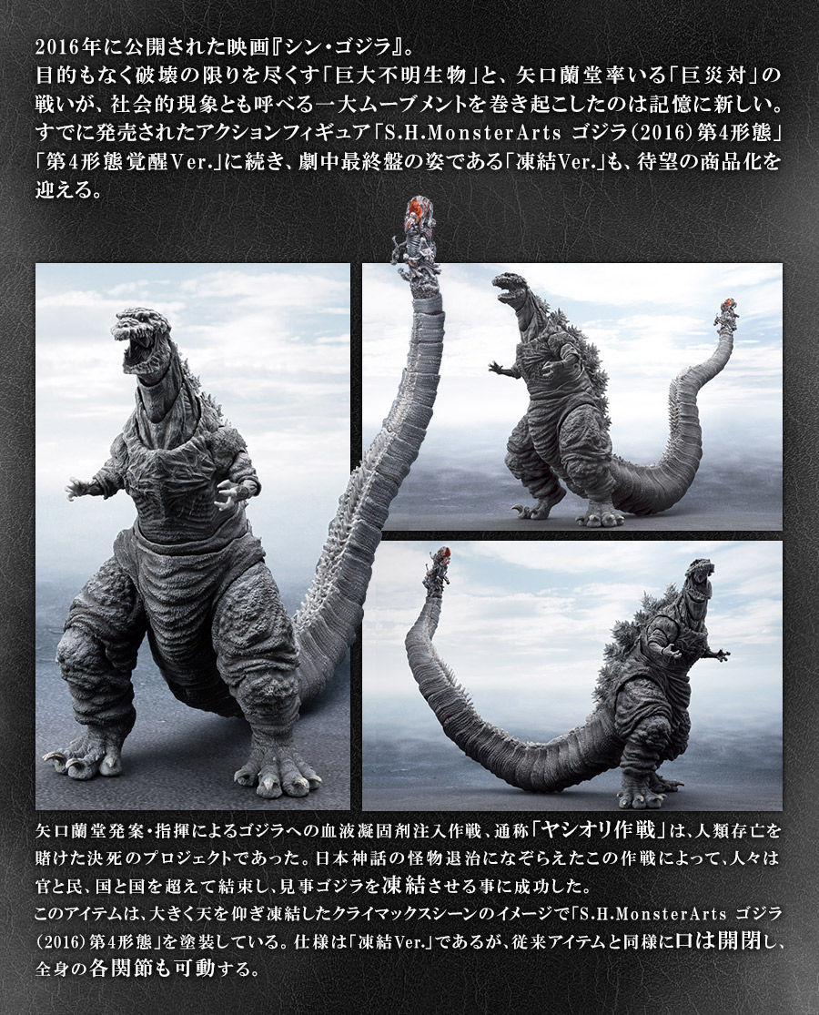 日Bandai萬代玩具公司的S.H.MonsterArts特攝可動系列,以《哥吉拉2016》電影作品為主題已經公開過了「哥吉拉(2016) 」、「哥吉拉(2016) 第四型態覺醒版本」、「哥吉拉 (2016)第二和第三型態」以及「哥吉拉(2016) 第4型態、第2型態 & 第3型態 哥吉拉商店限定配色」後,官網近日公佈將繼續推出「哥吉拉(2016)第4型態 凍結版本」的商品宣傳照片與販售相關資訊。!
