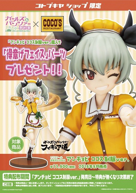 由日本壽屋玩具公司(KOTOBUKIYA)發行,將動畫《少女與戰車》的角色們立體化的「FIGURE道」系列日前發表了最新彈商品,來自《少女與戰車》與日本家庭餐廳 COCO'S 合作活動「COCO'S道的極致!」的「安丘比 COCO'S制服ver. 1/7比例上色完成品」預計於2018年8月發售的相關消息。