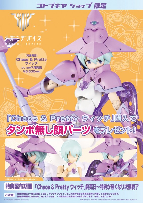 由日本壽屋玩具公司(KOTOBUKIYA)發行,結合機械與美少女的全新組裝模型系列「女神裝置(メガミデバイス)」繼第7彈「Chaos & Pretty 魔法少女」後,日前再度發表第 8 彈商品「Chaos & Pretty 魔女」預計於 2018 年 07 月發售的消息。