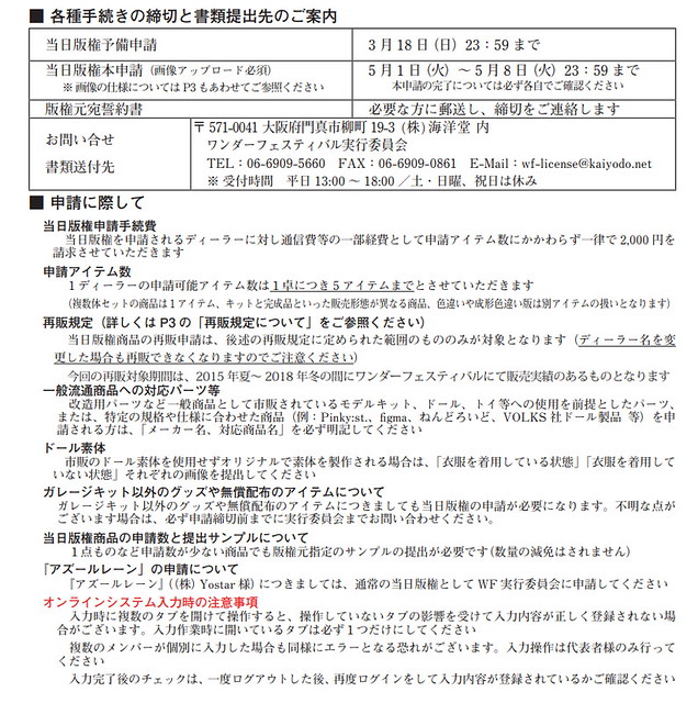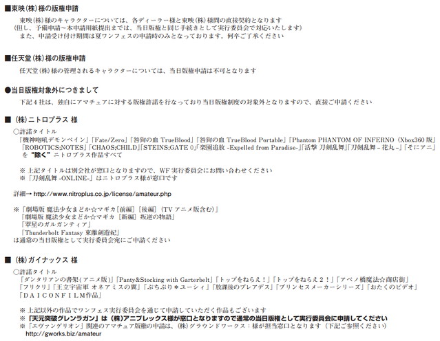 一般的版權申請程序是非常嚴謹的,必須提交複雜的書面資料、龐大的版權費,作品經過長時間的監修後才有可能商品化,一般的業餘原型師甚至可能連交涉的餘地都沒有。但這套「當日版權系統」大幅簡化了版權申請的手續,任何Dealer 只要提出簡易的申請資料、版權費、商品樣品,交由WF執行委員會向版權方交涉。雖然不是完美的,但至少能夠同時保護雙方的權益,也讓Dealer 更容易獲得當日販售的版權!不過要注意,獲得當日版權的商品僅限當日在會場內販售,活動結束後的展示、再販售、轉賣都是違法行為啊!