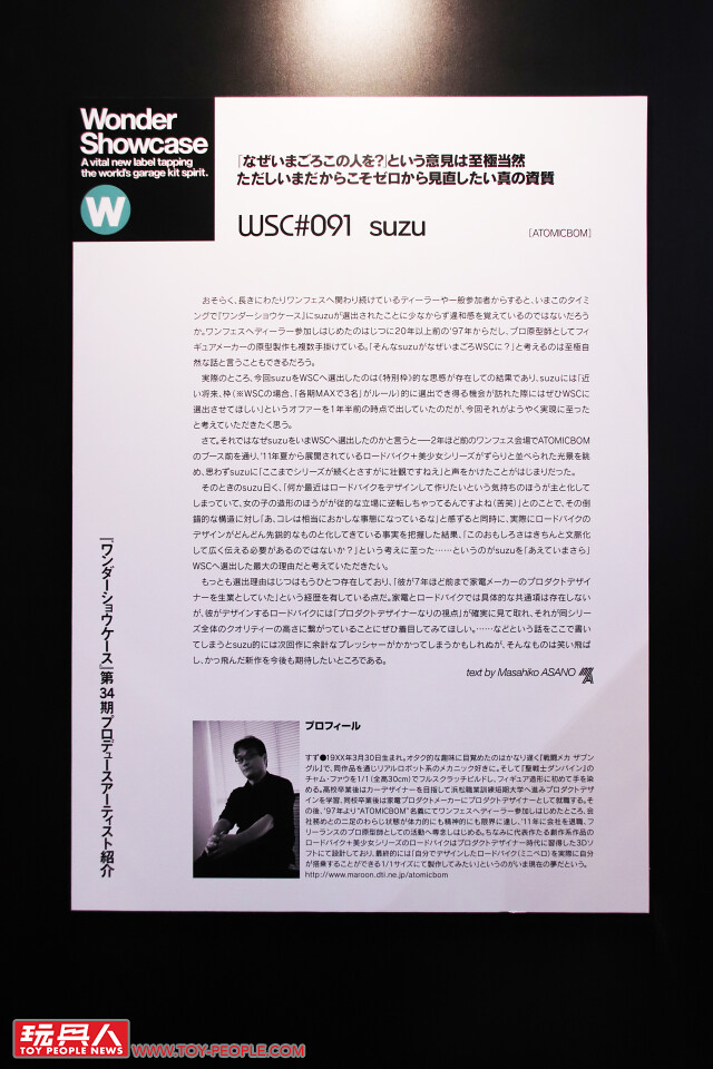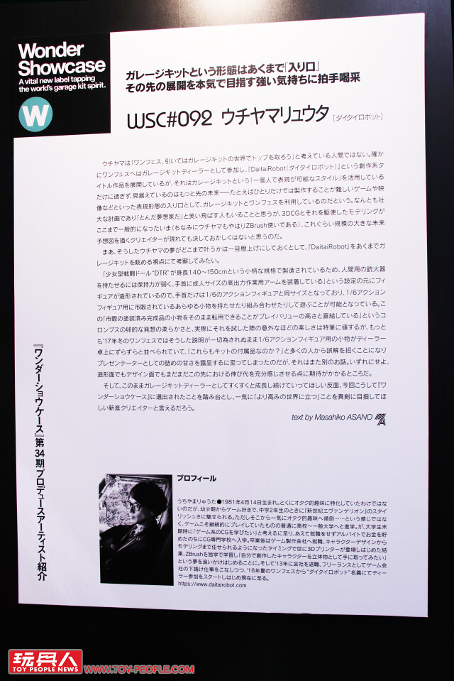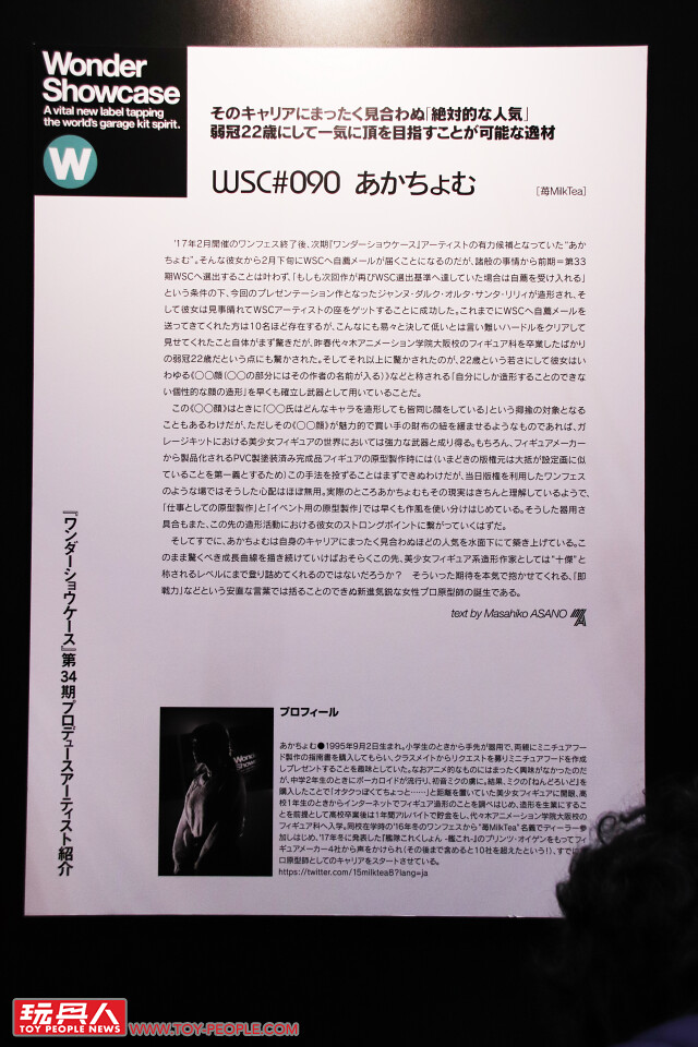 不過隨著參與的Dealer數量增加,抱持「比起追求質量,開心參加最重要」想法的人們也越來越多,這種想法雖然讓WF更為熱絡並不是壞事,但因此就讓擁有天份、對造型抱持滿懷熱情的原型師埋沒在人海中,未免也太可惜?WF設立的「Wonder Showcase」品牌便是為此而生,以提拔發跡於WF的新進造型作家為目的的育成計畫。簡單來說,就是從參加者中挑選出出色的造型作家,藉由官方廣泛地介紹,在提供作家未來可能性的同時,也將WF的「造型精神」傳承至下一個世代。自 1999 年夏季創立至今,「Wonder Showcase」已經挑選出近百位出色的造型作家。