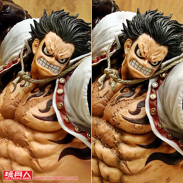 ▼ 接下來就讓我們深入感受一下這款作品的細節吧! 魯夫的奮力神情,額頭暴漲的青筋更加加強了銳利的眼神;肢體從上往下的架構,微微傾斜的頭部,都讓這款作品具有生動的姿態,更加逼真。
