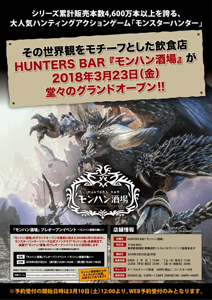 日本 CAPCOM 公司宣佈,以《魔物獵人》世界觀為主題的餐廳「HUNTERS BAR 萌夯酒場(モンハン酒場)」即將於 2018 年 03 月 23 日開幕!