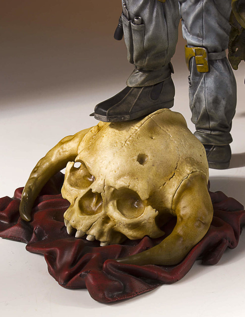 「波巴·費特 1/8 比例全身雕像」左腳踩在獵物頭骨,左手自然地垂放在左膝上,呈現出有點老派的帥氣姿勢,看著遠方彷彿是在搜尋另一個下手的目標,全身的裝備細節、飛行背包、頭盔皆考究還原,鎧甲有著金屬的厚重質感,手工塗裝、舊化戰損的刻畫更是精彩啊~每個凹陷的痕跡都代表一段驚險的故事,充分還原了波巴·費特身為賞金獵人的背景設定,除了本體之外,以雪怪「丸帕」(Wampa)頭骨來設計的地台不但造型搶眼,也襯托出波巴·費特是多麽強悍的狠角色~!