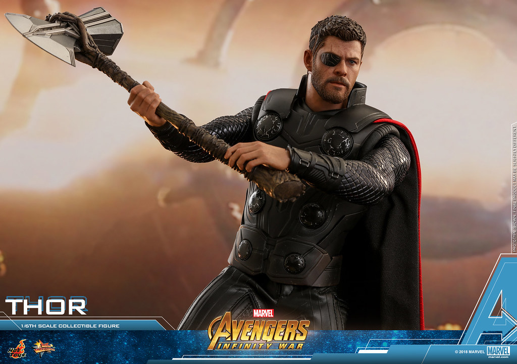 Hot Toys 本次所推出的MMS474 1/6 比例 雷神索爾,是接續了《雷神索爾3》片尾、為了悼念父親之死,索爾與洛基一同換上了黑衣的獨眼造型,最大的特色在於索爾獲得了半槌半斧的全新武器「STORMBREAKER(風暴錘)」,擁有揮舞時能夠產生巨大衝擊波與暴風的力量,這是利用了雷神之槌的碎片以及星際異攻隊樹人格魯特的手臂所鍛造的全新武器。 這把新武器的設定,出自於漫畫原作中的另一位雷神-「馬面雷神(Beta Ray Bill)」所使用的武器。